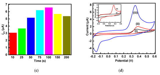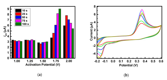 The significant enhancement in the electrochemical sensing performance reveals a well-differentiated very sharp oxidation peak that remains constant at various potentials and at various times, as shown in Figure 2b and c. The strong electrocatalytic properties of the formed g-C3N4 nanosheets are thin enough to penetrate electrons [25]. These results were similar to the electrochemical activation of carbon-based nanomaterials [26,27]. Therefore, the constant potential of 1.75 V for 100 s is ideal to enable further electrochemical measurements with the g-C3N4 nanosheets electrodes.