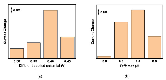 In order to determine the optimum conditions, chronoamperometric measurements under various applied potential, and at various pH levels, were explored. From the potential range from 0.30 V to 0.45 V along with the addition of 100 nM 5-HT in 0.1 M PBS (pH 7.0) was evaluated and the results are shown in Figure 3a.