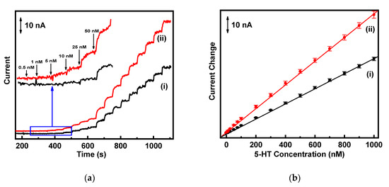 (a) Amperometric response of (i) bulk g-C3N4 and (ii) g-C3N4 nanosheets at 0.40 V in 0.1 M PBS (pH 7.0) with successive addition of 5-HT. Inset: The concentrations of 5-HT (0.5 nM, 1 nM, 5 nM, 10 nM, 25 nM, and 50 nM); (b) the corresponding calibration curves.