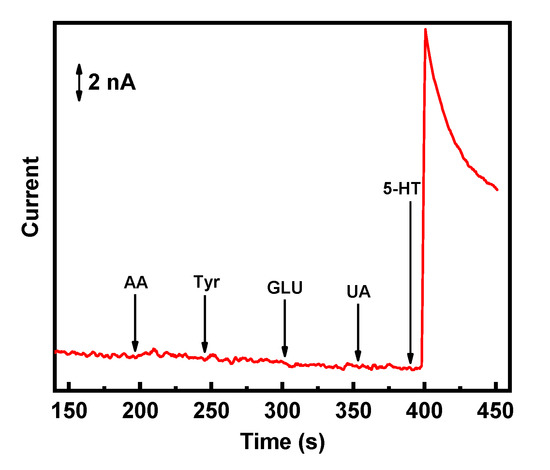 Poor selectivity is a critical issue when the sensors are applied to real biological samples for 5-HT detection. The electrochemically synthesized carbon-based nanomaterials are likely to have a stronger electrocatalytic effect than the noble metals [9,27]. Therefore, the selectivity of the sensor was explored to study the interference towards 5-HT detection at the potential of 0.4 V. Figure 5 displays the amperometric measurements recorded on the g-C3N4 nanosheets electrode for the successive additions of 2 µM of AA, UA, Tyr, GLU, and finally, 0.2 µM of 5-HT.