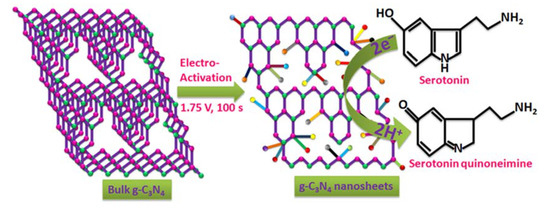 The design and fabrication of a metal-free carbon nanomaterials sensor, especially graphitic carbon nitride (g-C3N4) with a two-dimensional (2D) layered structure, is an analogue of graphene. The intriguing physicochemical and electrochemical properties of the g-C3N4 shows great versatility for applications in catalysts, lithium-ion batteries, hydrogen, optoelectronic devices, and electrochemical sensors [11,12,13,14,15]. In this context, the synthesis of high-quality monolayer g-C3N4 nanosheets with reduced structural defects became very crucial, and many researchers are focused on this issue. Ultrathin g-C3N4 nanosheets have recently been synthesized by prolonged ultra-sonication using a bulk g-C3N4 liquid exfoliation technique. Yet, this process might enable the preparation of a single-layered g-C3N4 structure, desirable for photocatalytic applications [16]. Cheng et al. [17] carried out chemical exfoliation of g-C3N4 sheets with sulfuric acid (H2SO4) as a strong oxidizing agent. However, other literature has shown that ultrathin g-C3N4 nanosheets developed by an electrophoretic method using the mixture of NaOH and melamine [18]. This method requires high voltage and alkaline medium with the complicated synthetic procedure, which proves very tedious and yields only negligible quantities. All these reports reinforce that the g-C3N4 nanosheets are more suitable electrochemical catalysts for sensor applications. Jiang et al. [19] pioneered their research on electrochemical sensors using bulk g-C3N4 to detect DA neurotransmitters. Gao et al. [20] also reported on the electrochemical g-C3N4 nanosheets sensor for the determination of cadmium. The porous g-C3N4-based composite was used for ascorbic acid detection [21]. The above reports consist of complex synthesis procedures and often urge researchers to focus on an easy electrochemical exfoliation of g-C3N4 nanosheets. Electrochemical exfoliation, which requires no costly equipment and is faster, more effective, and more controllable and is more appropriate to exfoliate g-C3N4 nanosheets from bulk g-C3N4 [22,23]. Moreover, there is no reported literature on the electrochemical determination of 5-HT using the g-C3N4 nanosheets.