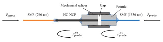 The sensing unit or gas cell is made of a piece of HC-NCF, as shown in Figure 1. One end of the HC-NCF is connected to a single mode fiber (SMF) at the pump wavelength (~760 nm) by fusion splicing, and the other end is butt-coupled to a SMF at the probe wavelength (~1550 nm) via a ceramic sleeve and ferrules, which are fixed together with ultraviolet curing glue. There is an air gap (<1 µm) at the HC-NCF/SMF butt-coupled joint to facilitate gas filling to the HC-NCF.