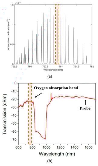The absorption spectrum of oxygen around 760 nm is shown in Figure 2a. We used the absorption line around 760.88 nm, which had an absorption coefficient of 1.425 × 10−3 cm−1 at 293 K and 1 atm for a relative concentration of 100% []. The transmission spectrum of the HC-NCF used in this work is shown in Figure 2b. As shown in Figure 2c, the HC-NCF has an inscribed air-core with diameter of ~35 μm, which is surrounded by seven capillary rings with diameter of 17.5 μm. The HC-NCF has double transmission windows covering wavelength from below 600 to ~800 nm and from ~1 to beyond 1.7 µm. We operate the pump laser at 760.88 nm to produce PT phase modulation and use a probe laser at 1550 nm to detect the phase modulation.