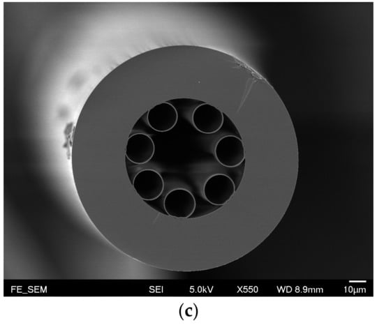 - Pryamikov, A.D.; Biriukov, A.S.; Kosolapov, A.F.; Plotnichenko, V.G.; Semjonov, S.L.; Dianov, E.M. Demonstration of a waveguide regime for a silica hollow—Core microstructured optical fiber with a negative curvature of the core boundary in the spectral region > 35 μm. Opt. Express 2011, 19, 1441. [Google Scholar] [CrossRef] [PubMed]