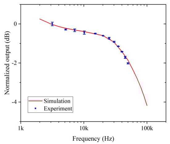 On the basis of considering the relaxation time and heating efficiency of oxygen, we further investigate the PT phase modulation in the HC-NCF. By using COMSOL Multiphysics software, we numerically calculated the PT phase modulation for varying pump modulation frequency in the oxygen-filled HC-NCF []. The mode fields for the pump and the probe in the HC-NCF are approximated as Gaussian distribution with mode field radiuses of 12.5 μm at 760 nm and 13.5 μm at 1550 nm. The cladding material of the HC-NCF is silica and its central region is filled with 20.8% oxygen balanced in nitrogen. The ambient temperature and gas pressure are assumed to be 293 K and 1 bar, respectively. The thermal parameters of nitrogen are used in solving the thermal conduction equation. The pump is sinusoidally modulated at frequency f, which is varied from 2 kHz and 100 kHz. Based on these conditions mentioned above, the amplitude of PT phase modulation as a function of modulation frequency can be obtained. For the convenience of comparison, we selected the amplitude of PT phase modulation at 3 kHz as the reference value and the normalized output is expressed as a level in decibels (dB) by evaluating ten times the common logarithm of the ratio of the simulation results to the reference value, which is represented by the red line in Figure 3. The blue dots are the data obtained from the experiment, which will be described in the next section. At low pump modulation frequencies, the PT phase modulation shows a relatively flat response. At high pump modulation frequencies (e.g., f > 15 kHz), due to the slow thermal conduction related to the buffer gas thermal parameters and fiber characteristics, the change of temperature field could not catch up the laser modulation rate, leading to a reduced amplitude of PT phase modulation.