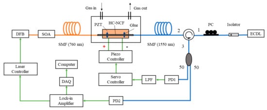 Figure 4 depicts the setup of the PTI-based oxygen detection system using the HC-NCF. We use a distributed feedback (DFB) laser with wavelength around 760 nm and linewidth of ~10 MHz as the pump and a semiconductor optical amplifier (SOA) to amplify pump power to about 30 mW. The pump laser is wavelength-modulated sinusoidally, and at the same time, slowly scanned across the oxygen absorption line at 760.88 nm. The pump beam is delivered into the HC-NCF via the SMF (760 nm), propagates through the HC-NCF, and is eventually blocked by the optical circulator. The probe beam is from an external cavity diode laser (ECDL) with a full-width-half-maximum (FWHM) linewidth of 300 kHz, and its wavelength is fixed to 1550 nm. The probe is delivered to the HC-NCF via the SMF (1550 nm), and the reflected probe from the FPI is detected by PD1 and PD2. The power level of the probe laser is 5 dBm, and the power reaching the photodetectors is –17 dBm. The length of the HC-NCF is 4.3 cm. From Equation (1), the amplitude of PT signal is linearly proportional to the length of the HC-NCF. However, the use of a longer HC-NCF increases the gas filling time. The filling time of the HC-NCF is less than 1 min, as has been demonstrated previously with the same type of HC-NCF but of a slightly longer length []. The HC-NCF is mounted on a piezo-electric transducer (PZT) with two fixing points using ultraviolet glue. The cavity length can be servo-controlled via the PZT stretcher, using the DC output component from PD1 as the control signal, to ensure that the FPI is always operating at quadrature at the probe wavelength.