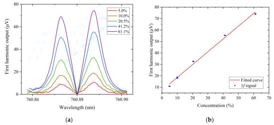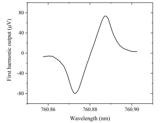 All the experiments were conducted under laboratory conditions without temperature/pressure control. The 1f signal as a function of modulation frequency from 3 kHz to 50 kHz was measured with laboratory air with an estimated oxygen concentration of ~20.8%. For comparison with numerical simulation, the 1f signal is normalized to the value at 3 kHz and expressed in dB, which is represented as the blue dots in Figure 3. Since the PT signal decreases gradually with increasing pump modulation frequency above 15 kHz, we fixed the pump modulation frequency to 15 kHz for subsequent oxygen concentration detection experiments. The first harmonic output is shown in Figure 5. The peak-to-peak amplitude of the 1f signal is 153.5 µV when the pump laser is scanned across the absorption line of oxygen. The system noise of 0.25 µV is estimated by tuning the pump wavelength away from the absorption line and being fixed at 760.9 nm. For a lock-in time constant of 1 s with a filter slope of 18 dB/Oct, the signal-to-noise ratio (SNR) is calculated to be ~614, corresponding to the noise equivalent concentration (NEC) of 339 ppm.
