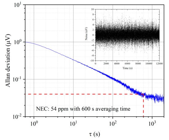 We also conducted the Allan-Werle deviation analysis to investigate the stability of the detection system. The 1f signal for oxygen in atmosphere was recorded for over 3 h when the pump wavelength was away from the absorption line and fixed at 760.9 nm. The time constant of the lock-in amplifier was set to be 100 ms and the sampling rate was 10 Hz. The Allan-Werle plot is shown in Figure 7. The optimal averaging time is ~600 s, at which the noise is ~0.04 µV. The corresponding NEC for a SNR of unity is then estimated to be 54 ppm. The NEC for a 100-s averaging time is 135 ppm.