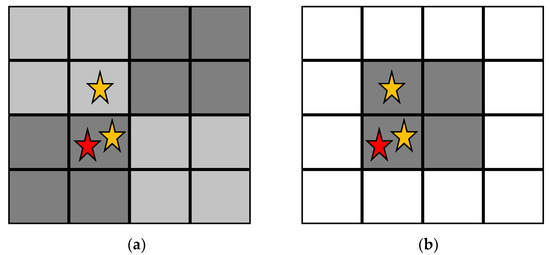 A 16 pixel array containing 3 detected events, with the red star representing the first of these events to be detected. (a) Static charge sharing correction algorithms (CSCAs) predefine the various search areas (shades of grey) before any events are detected. (b) In contrast, dynamic CSCAs define search areas after an event is detected based on a predetermined rule. In this case, the dynamic 2 × 2 CSCA is being applied, so the 2 × 2 search area is defined such that the first detected event is in the bottom left pixel of the search area.
