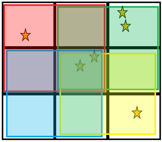 The Hybrid CSCA works by first constructing a 3 × 3 search area according to the rules of the Neighbourhood locality (NL) type to which it belongs. Next it constructs 4 overlapping 2 × 2 sub-search areas within the initial 3 × 3 search area. The total charge in each sub-search area is compared, with the highest total being assigned to the output. In this example, assuming all stars represent the same amount of charge, the green search area (top right) would determine the output as it contains the highest total charge (4, compared with 3 for yellow (bottom right) and red (top left), and 2 for the blue (bottom left)).