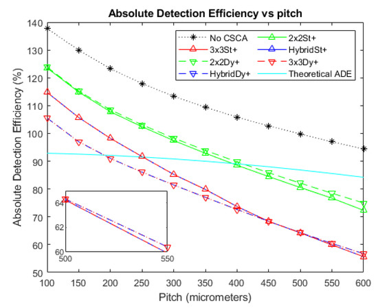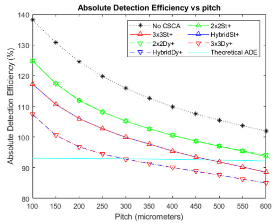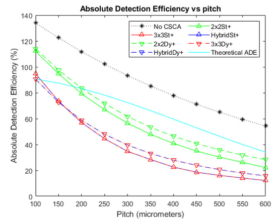 A plot of Absolute Detection Efficiency (ADE) versus pixel pitch at an incident photon flux of 106 photons mm−2 s−1. The Hybrid and 3 × 3 CSCAs perform indistinguishably according to this metric, resulting in significant overlap. Similarly, the 2 × 2 dynamic and static CSCAs overlap almost entirely at this flux level. The case where no CSCA is applied is also shown, along with the theoretical ADE value proposed earlier as a reference.