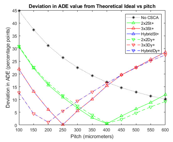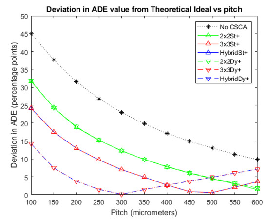 A plot of ADE versus pixel pitch at an incident photon flux of 108 photons mm−2 s−1. The Hybrid and 3 × 3 CSCAs perform indistinguishably according to this metric, resulting in significant overlap. The case where no CSCA is applied is also shown, along with the theoretical ADE value proposed earlier as a reference.