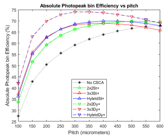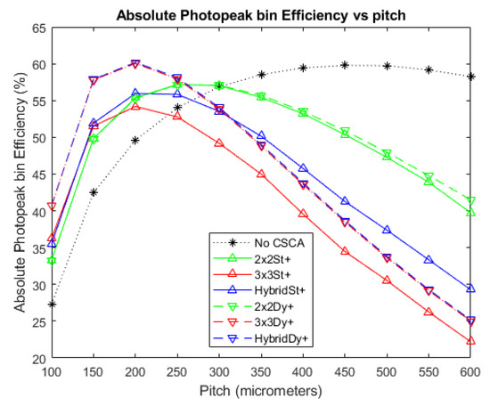 Considering next the relative heights of the peaks in Figure 8 and Figure 9, we can again see the importance of pulse pileup in determining which CSCA is most suitable for a given situation. At lower fluxes (Figure 8) all CSCAs result in a higher peak APE value than the No CSCA case and outperform the No CSCA case in at almost all pitches. In contrast, at higher fluxes (Figure 9) the No CSCA is the best option for over half over the pitches considered (>300 µm) and can achieve a peak APE value higher than any CSCA except for the dynamic 3 × 3/Hybrid. The fact that the dynamic 3 × 3/Hybrid CSCAs can produce the highest peak APE value under fluxes where the static 3 × 3/Hybrid CSCAs produce the lowest peak values shows that the geometric advantage is much larger than the pileup disadvantage at these per pixel fluxes. Being able to determine the ranges of fluxes and pitch over which this kind of thing happens is an advantage of simulated investigations such as this.