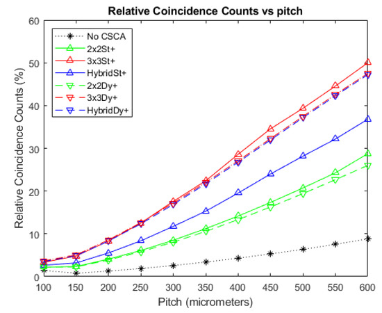 Figure 10 shows how the RCC vary as a function of pixel pitch at a photon flux of 107 photons mm−2 s−1. The case where no CSCA is applied is considered, in addition to data for when the various CSCAs are applied. As coincidence counts can only be produced by pulse pileup, RCC values are a proxy for pulse pileup and consequently a lower value represents less pileup and thus better performance. All CSCAs experience higher RCC values than the No CSCA case, with 2 × 2 CSCAs having lower RCC values than their 3 × 3 and Hybrid counterparts. For both the 3 × 3 and 2 × 2 CSCCAs the dynamic and static NL methods produce similar results at small pixel pitches; however, they increasingly diverge as pixel pitch increases, with dynamic CSCAs outperforming their static counterparts. In contrast, the static Hybrid CSCA performs better than the dynamic Hybrid CSCA at all pitches investigated here, with its advantage growing as pixel pitch increases.