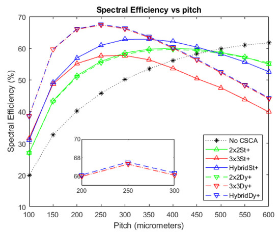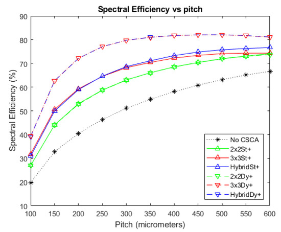 For reasons already established when discussing the previous metrics, 3 × 3 and Hybrid CSCAs peak earlier than their 2 × 2 counterparts (due to larger effective pixel size), the dynamic 3 × 3 CSCA outperforms the static 3 × 3 CSCA (due to geometric advantage) and the dynamic Hybrid CSCA outperforms the static Hybrid CSCA at lower fluxes (Figure 11) and smaller pixel sizes (Figure 12 at pitches below ~ 350 µm) due to geometric advantage, but under performs it at higher per pixel fluxes (Figure 12 for pitch above ~350 µm) due to the geometric affects becoming disadvantageous.