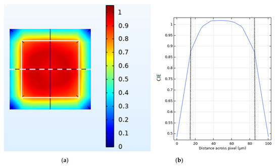 (a) Heat map representing charge induction efficiency (CIE) across a single pixel as generated and viewed in COMSOL. The plot represents a cut through taken perpendicular to the incident photon flux. The edges of the anode are marked by the white square superimposed on the image. (b) A plot of CIE vs. distance along a path taken across the centre of the pixel (the horizontal dashed white line in Figure 14a).