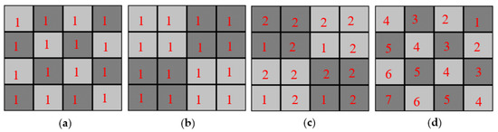 At higher fluxes (Figure 5), dynamic CSCAs show higher ADE values than their static counterparts for both the 2 × 2 and 3 × 3 NS types however, and we propose that this can be explained by something we call “variable pixelation”. This refers to the fact that, due to the way that search regions are defined, dynamic CSCAs can have higher maximum count rates than their static counterparts. Consider the case of a 4 × 4 pixel array shown in Figure 15. When no CSCA is running the maximum number of counts per cycle that this detector can report is 16 (Figure 15a), whilst for a static 2 × 2 CSCA the maximum number is 4 (Figure 15b). In both cases the maximum counts per cycle are equal to the fixed number of pixels available to report. Dynamic CSCA do not have a fixed number of pixels however, and with the right (extreme) stimulation can produce counts per cycle in the range of 4–16 (Figure 15c,d). In practice they are likely to produce some in-between value. To support this claim, a smaller series of Monte Carlo simulations was performed, considering a subset of the pixel pitches used in the main study. For these simulations, pixels were treated as having an infinitely long deadtime so that they could only record one count at most. Pixels were then selected at random (with a rectangular distribution) and neighbourhoods constructed according to the dynamic allocations rules used in the main study. The process was then repeated until all pixels had reported at least one count and the total number of counts, Cmax, was recorded. The process was repeated 104 times and average values of Cmax calculated. The results of this verification can be seen in Table 3.