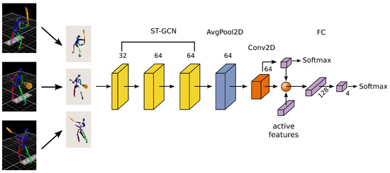 The classifier model consists of a 3-layer ST-GCN: pooling, convolution and volutional layer. The whole structure is presented in Figure 3. The first spatial temporal convolutional layer consists of 32 kernels, the second and third have 64 kernels each. The output from the third layer is the average pooled in joints and temporal directions and passed through a convolutional layer. The output of this layer is connected with a layer of dimension 3 (corresponding to 3 identified states), followed by a softmax function to generate class labels. ReLU nonlinearity are followed after all ST-GCN layers and BatchNorm layer is also followed after all layers, omitting fully connected layer which was not shown in Figure 3 due to the clarity of the image. The active features box provide an important data for action recognition. It consists of two types of parameters: movement parameters, describing acceleration and velocity of single joints and posture data, characterizing distance and angles between joints in two triangular areas: lower (left feet, spine, right feet) and upper (left hand, head, right hand) limb. The data combined with ST-GCN output are passed through a fully connected layer.