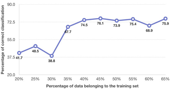 For each of the proposed classifiers, a series of tests were carried out consisting in randomly dividing the available data into a training set and a test set. When dividing the considered sets, different proportions were used between the sets, starting from 10% to 65% share of teaching collections. Three independent replicate trials were performed for each division and the results obtained were collected.