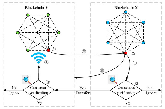 The cross-chain communication process of blockchain X and Y is shown in Figure 3. There are multiple nodes of power production, sales and consumption in both energy blockchain networks, in which: