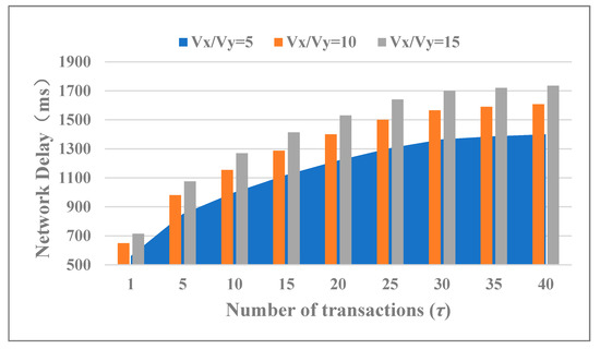 The operating efficiency and influencing factors were analyzed by the network delay caused by cross-chain smart contracts executing under different conditions. Reset the parameters of the above-mentioned: Nx = Ny = 60, Vx = Vy = 5, 10, 15 and τ took different values in the interval [1, 40] with a step size of 5. The actual cross-chain network delay varied with the Vk and τ as shown in Figure 5. It can be seen that the network delay increased significantly when τ ∈ (1, 25] and increased slowly when τ greater than 30. Increasing transactions in a single consensus would result in an increase in the average network delay for individual transactions although it is beneficial for improving the system throughput. Moreover, network delay increased to a certain extent with the number of nodes for cross-chain consensus verification due to the increase computational cost in consensus signature and consensus signature verification.