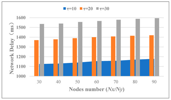 It is necessary to analyze the influence of the total number of nodes in a multi-microgrid system on the operation efficiency. Hence, the number of verify nodes was fixed Vx = Vy = 10, the number of transactions took τ = 10, 20, 30. The number of nodes Nx and Ny all took different values in the interval [30, 90] with a step size of 10. The actual cross-chain network delay varied with the N and τ as shown in Figure 6. It can also be seen that the number of transactions in a single consensus had a significant impact on network delay. However, the nodes number in both blockchains had no obvious effect on the network delay.