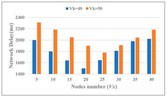 Consider a situation of unequal rights between the partners of the blockchains in an actual application scenario. Hence, the total set of verify nodes Vk = 40, 50 while Vy took different values in the interval [5, 38] with a step size of 5. Reset the parameters of the above-mentioned: τ = 20, Nx = Ny = 60. The actual cross-chain network delay varied with the Vx and Vy as shown in Figure 7. It can be seen that when the total number of nodes for cross-chain consensus verification was fixed, as the number of subgroup verification nodes changes, cross-chain trading delay fluctuates regularly. Moreover, when the number of verification nodes in each subgroup was close, the network delay was lower, and vice versa. Therefore, the difference in the credibility of participating nodes in each blockchain would affect the cross-chain network delay.