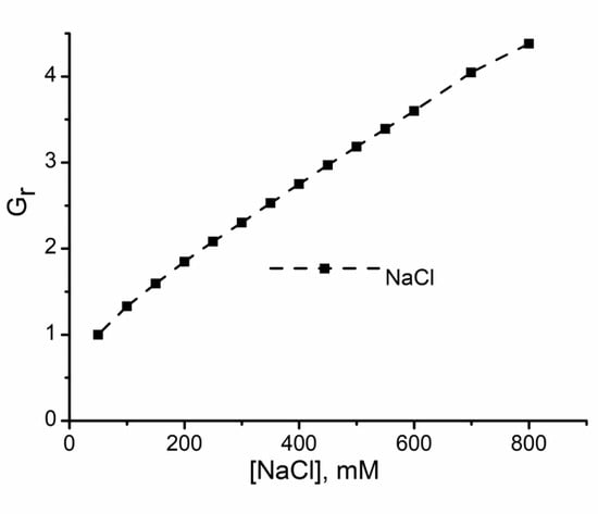 Addition of monovalent ions to the bulk electrolyte solutions bathing lysenin channels inserted into planar lipid membranes leads to an anticipated increase of the relative macroscopic conductance in a concentration-dependent manner (Figure 1) [,]. Given the linearity of the plot, there is no doubt that this trend originates in the increased solution conductivity after ion addition; therefore, no change in the channel’s conformation and geometry is observed. Consequently, monovalent anions and cations do not modulate the channel’s conductance other than by adjusting the electrolyte solution’s conductivity [,].