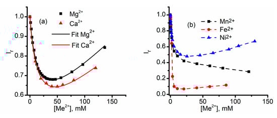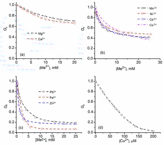 where I is the current through the fully open channels, It is the current after Me2+ addition (both currents are measured at the same voltage, therefore their ratio represents the relative change in macroscopic conductance Gr), K0 is the specific conductivity of the bulk before Me2+ addition, b is a factor accounting for the linear changes in conductivity upon Me2+ addition, f is the ratio between the open/sub-conducting channel conductance in otherwise identical conditions, and α is the equilibrium constant of the channel–ion binding process []. The above equation predicts that for channels undergoing transitions to only sub-conducting states (no full closing, irrespective of the inhibitor’s concentration), the currents should first decrease until all channels attain sub-conductance, after which the currents should increase upon ionic additions owing to the increased conductivity of the solution. In contrast, a full closing of the channel in two or more steps would lead to a continual decrease of the ionic currents in response to an increasing inhibitor concentration. This model was tested for investigating the macroscopic currents recorded in the presence of Ca2+ and Mg2+, and the excellent fit of experimental data with Equation (1) (Figure 6a) demonstrate the existence of highly stable sub-conducting states upon influence exerted by the divalent cations. In the same line, stable sub-conducting states were also suggested for other divalent metal ions, as inferred from local minima in the inhibition curves (Figure 6b) []. The different inhibitory effects may be explained by accounting for more than one sub-conducting state or assuming that not all the ions lead to the same conductance ratio between the open and sub-conducting states.