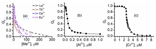 Addition of trivalent metal ions to the support electrolyte solutions also shows a concentration-dependent decrease in the macroscopic conductance of lysenin channels (Figure 3) [,]. In contrast to the action of most divalent metal ions, the macroscopic conductance is practically suppressed at trivalent metal ion concentrations in the sub-millimolar range; among all tested divalent metal ions, only Cu2+ shows such strong inhibitory capabilities. As with divalent ions, the extent of inhibition depends on the concentration and chemical identity of trivalent ions. The tested lanthanides reduce the macroscopic conductance to negligible near-zero values at concentrations ranging from 50 to 250 µM (Figure 3a), while Al3+ shows a much stronger inhibition and produces a similar effect in the µM range (Figure 3b). Nonetheless, the inhibition curves for these trivalent ions are qualitatively similar and resemble the effects recorded for divalent metal ions. A more intricate inhibition curve is presented by Cr3+ (Figure 3c), which significantly reduces the ionic transport through the channels at concentrations under 10 µM. However, the concentration dependency of the inhibition is qualitatively different from all the other ions; the pronounced sigmoidal shape suggests a strong positive cooperativity [], with maximum effects in the range 2–4 µM.