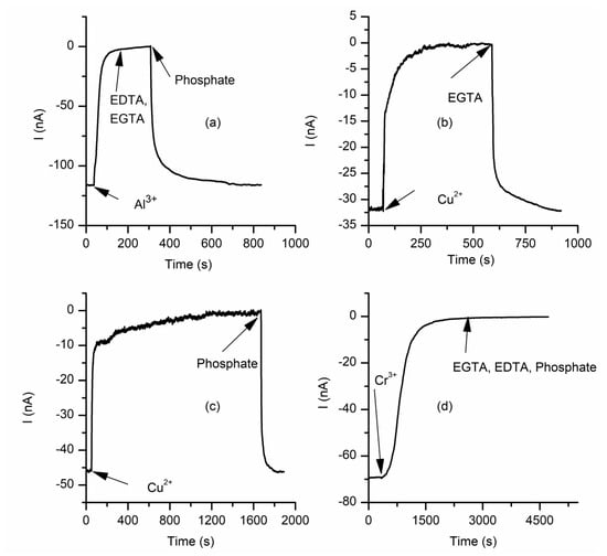 The changes in macroscopic conductance of lysenin channels upon exposure to multivalent metal ions may be further exploited for sensing applications. An important feature of such sensors would be their reusability, which is conditioned by the reversibility of interactions with multivalent ions. In this endeavor, a few studies focused on investigating eventual changes in macroscopic conductance manifested upon removal of multivalent ions from the support electrolyte [,]. The decrease in macroscopic conductance observed upon addition of small amounts of La3+ ions is completely reversed by EDTA addition []. EDTA chelates the La3+ ions, which reinstates the original macroscopic conductance; therefore, the channel–ion interactions are reversible. This process is fast, which suggests that the multivalent ions likely interact with the inserted channels and adjust their conducting properties rather than damaging or pulling them from the support membrane []. Buffer exchange would be the most universal method to remove the multivalent ions from solutions [], but to avoid membrane rupture during the procedure, chelators and precipitation agents may be used for this task [,]. Al3+ ions are among the most potent inhibitors of lysenin channels’ conductance but EDTA or EGTA do not chelate them (Figure 4a). However, addition of phosphate ions to the bulk solutions leads to precipitation and fast recovery of macroscopic conductance (Figure 4a) []. Cu2+ ions, the most powerful divalent inhibitors, may be easily chelated by EGTA (Figure 4b) or precipitated by phosphate (Figure 4c) in a matter of minutes [], leading to a full restoration in conductance.