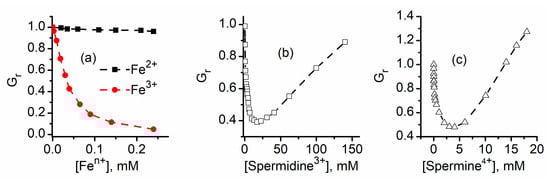 Charge and size influence on the inhibitory effects of multivalent cations. (a) The inhibitory effects presented by Fe strongly depend on the ionic charge, and Fe3+ is a more efficient inhibitor than Fe2+. Voluminous organic ions, such as spermidine3+ (b) or spermine4+ (c), present less inhibitory efficiency, in spite of their large charge. Additionally, the inflection point in the inhibition curves indicates that both cations modulate the channel’s conductance by inducing transitions to sub-conducting states. Adapted from [] (panels a,b) and [] (panel c), with permission.