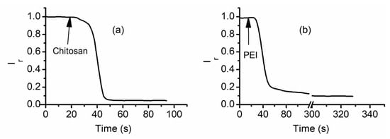 Cationic polymers inhibit the ionic currents through lysenin channels. The evolution of the relative ionic currents measured through lysenin channels upon exposure to (a) 8 µM chitosan, and (b) 4 µM PEI. Published under Creative Common Attribution License in [].
