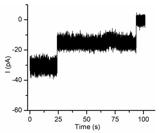 Adjustments of conductance in response to chemical stimuli are an essential biological function of canonical ion channels in living cells [,,], and such features may be replicated in vitro for sensing purposes. However, ion channel reconstitution in artificial membrane systems is not always an easy task [,,]. Besides not always being readily available, the channels often have narrow confinements that limit the magnitude of the ionic currents and the size of the analytes passing through. As alternatives, porins and pore-forming toxins present similar functionalities to ion channels in terms of creating transmembrane conducting pathways and ensuring high transport rates [,,,]. Although they often lack selectivity and regulation, which might be an important characteristic for sensor development, they are amenable to chemical and genetic modifications aiming at introducing specific bio-recognition elements into their structure and changing their response to stimuli [,,,]. Porins and pore-forming toxins often present a large conducting pathway, which not only ensures greater ionic currents but also allows passage of larger analytes for translocation-based sensing.