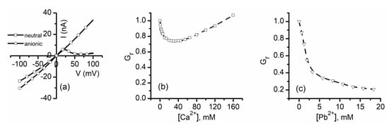 A large body of evidence supports the hypothesis that lysenin channels exposed to multivalent cations transition to non-conducting or sub-conducting states by mechanisms characteristic to ligand-induced gating. However, lysenin channels also present a strong voltage-induced gating, which manifest as reversible complete channel closure at positive transmembrane voltages [,]. This regulatory mechanism raises the question whether the two gating mechanisms (i.e., voltage and ligand induced) are related. To address this fundamental question, the inhibitory effects of metal cations were evaluated in experiments that used neutral lipids to produce the lipid membrane, which suppressed the lysenin channel’s voltage-induced gating [,]. Upon insertion into membranes containing anionic lipids, lysenin channels show a strong voltage-induced gating, while the use of electrically neutral lipids abrogates this remarkable regulatory feature and leads to a linear I-V plot (Figure 11a). In spite of changes in voltage-gating regulation, lysenin channels inserted into neutral membranes do not show changes in their sensitivity to ions []: Ca2+ (Figure 11b) and Pb2+ (Figure 11c) additions inhibit the macroscopic currents and the inhibition curve presents the inflection point characteristic of stable sub-conducting states. In the same line, irreversible changes in the lysenin channel’s conductance induced by cationic polymers when neutral membranes are used [] support the hypothesis that voltage and ligand-induced gating are realized through distinct mechanisms.