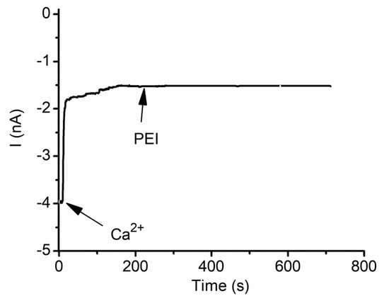 Multivalent ions and cationic polymers compete for the binding sites present in the lysenin channel’s structure. After channel blockage and transition to sub-conducting states by Ca2+ addition (40 mM final concentration), PEI (10 µM final concentration) does not show further inhibition of the ionic currents. Published under Creative Commons Attribution License in [].