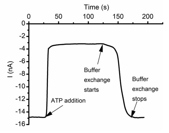 All the experiments conducted on inorganic and organic ions did not reveal any influence on the channel’s conductance presented by small inorganic anions, which apparently do not interact with lysenin. However, a significant conductance modulation is observed when purines (ATP, ADP, and AMP) are added to the support electrolyte []. Addition of ATP (20 mM final concentration) to the support electrolyte quickly reduces the macroscopic ionic currents established through lysenin channels (Figure 13). However, buffer exchange with ATP-free solutions fully reinstates the conducting properties and proves reversibility. Single-channel experiments show that the interactions between lysenin channels and ATP do not imply gating [], and suggest binding and partial occlusion as plausible explanations.