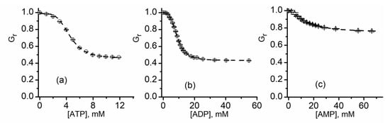 Changes in relative conductance induced by addition of ATP, ADP, or AMP. The relative changes in macroscopic conductance Gr show that ATP (a) and ADP (b) were more efficient inhibitors compared to AMP (c). The dashed lines in each panel represent the fit with the Hill equation, which is used to determine IC50 and n. Adapted from [], with permission.
