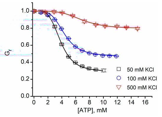 Ionic screening reduces ATP inhibitory effects. The relative conductance indicates that increased ionic screening elicited by addition of KCl minimize the conductance changes induced by ATP addition. The continuous lines represent the fit with the Hill equation (Equation (2)). Adapted from [], with permission.