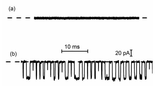 Therefore, it is worth mentioning and presenting investigations performed by our group on DNA translocation through lysenin channels []. To suppress the voltage-induced gating that manifests at positive voltages, single lysenin channels were reconstituted into a bilayer lipid membrane composed of neutral lipids [,]. No transient changes in the open ionic current were visible when 69 nt DNA (5 nM final concentration) was added to the reservoir wired to the headstage and biased by a negative potential (Figure 16a). Since the electric field for this configuration has the correct orientation to drive the DNA molecules through the channels into the opposite reservoir, the logical conclusion is that the DNA molecules do not thread the channels. However, polarity reversal (positive potential on the reservoir connected to the headstage) and ssDNA addition to the grounded reservoir elicits fast and deep changes in the open ionic current of a single lysenin channel, resembling translocation (Figure 16b). These observations confirm that wild-type lysenin may prevent DNA translocation (most probably due to electrostatic repulsions) when the molecules are added to the stem side of the channel. They also confirm the necessity to suppress the voltage-induced gating by using neutral lipids for ssDNA translocation experiments.