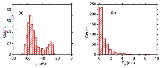 From Figure 15 and the distribution of the current blockage (ID) and dwell time (Td) (Figure 16), one may easily observe that the current drops are relatively uniform for the recorded events (~ 56 pA); however, some short and reduced-magnitude spikes are observed in both the current trace (Figure 16b) and ID histogram (Figure 17a). This type of noise is common in translocation experiments, and it is considered a consequence of molecules colliding with the mouth of the pore without being captured by the electric field and translocated [,,,]. As opposed to the relatively uniform changes in the ionic current, the dwell time seems to be not only unusually long for some events but also extremely variable compared with other ssDNA translocation experiments (Figure 17b). This might be a consequence of DNA “stickiness” to the channel’s lumen, which may be explained based on the investigations of lysenin channel interactions with purines (vide supra, and []). The resulting exponential decay shape of the dwell time distribution is common for macromolecule translocation through narrow “sticky” nanopores [,,,,,].