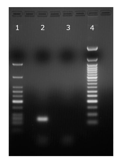 The analysis of translocated ssDNA performed by gel electrophoresis (2% agarose) after PCR amplification. (1) Low Molecular Weight Marker (25–766 bp), New England Biolab; (2) Amplicon produced from ssDNA molecules translocated through lysenin channels; (3) The absence of DNA indicates that a reversed polarity prevents translocation. (4) 50 bp Ladder Marker, New England Biolabs.