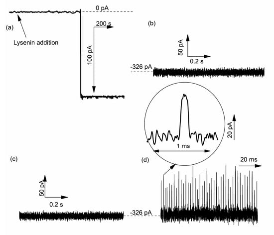 The large interest in DNA translocation was fueled by the promise of fast and reliable sequencing [,,,]. However, single molecule detection and characterization of peptides molecules is equally important; numerous synthetic and natural nanopore sensing platforms have been employed for such tasks [,,,,,], and lysenin is one of them []. Lysenin was investigated as a stochastic sensor for the short octameric peptide angiotensin II (Ang II) []. After single channel reconstitution in neutral lipid bilayers (Figure 19a), no transient changes in the ionic current established through two channels was observed at −80 mV bias potential (Figure 19b). A similarly quiet baseline was recorded after Ang II addition to the reservoir hardwired to the headstage (Figure 19c); Ang II is a positively charged peptide, and the particular orientation of the electric field prevented its translocation. However, peptide addition to the ground reservoir in otherwise identical electrical and solution conditions shows frequent transient changes in the open ionic current, resembling translocation through other biological channels (Figure 19d).
