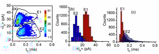 Signal analysis in terms of the average current blockage <IB> and dwell time tD performed with the Transalyzer software package [] provides some important insights into the origin of recorded events. The density plot of the recorded events shows two relatively well separated clusters, E1 and E2, respectively (Figure 20a). Further analysis of the events in each cluster indicates a good separation in terms of current blockage <IB> (Figure 20b) and overlapping in terms of dwell time (Figure 20c). The existence of multiple clusters more or less overlapped is common for translocation experiments, especially when short peptides are used as analytes. In this case, based on previous explanations provided for similar experiments it was concluded that the events E1 are characteristic to Ang II molecules that translocated through the open channel, while E2 events represent collisions with the pore [].