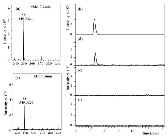 LC-MS identification of translocated Ang II peptide molecules. (a) MS reference indicates an m/z ratio of 349.5 (z = 3+) for a lysenin sample. (b) LC chromatogram of the reference Ang II. MS (c) and LC (d) detect and identify Ang II translocated into the negatively charged reservoir. No Ang II is detected upon application of positive transmembrane voltages (e) or following lysenin channel blockage by chitosan (f). Published under Creative Commons Attribution License in [].