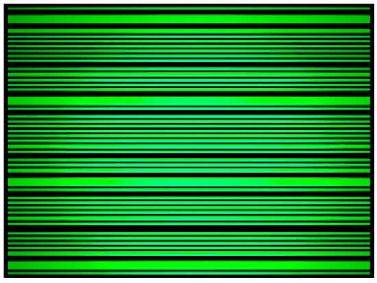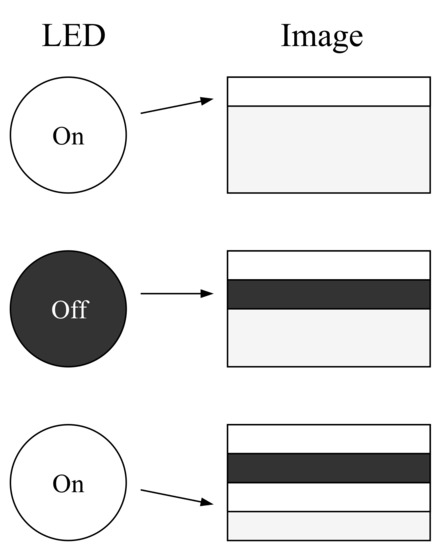 We now describe our implementation of an OOB channel with blinking LED lights. Modern digital active pixel sensors that are found in smartphones are typically produced using Complementary Metal-Oxide-Semiconductor (CMOS). When compared to Charge-CoupLED Device (CCD) sensors, CMOS sensors have lower power consumption and are easier to manufacture. CMOS sensor cameras capture images using an electronic rolling shutter [59]. This implies that every image is captured progressively by exposing each row of pixel sequentially. This can be utilized for transmitting data with Visible Light Communication (VLC) [60] by encoding it into a binary format and transmitting it to the camera with a blinking Light-Emitting Diode (LED). If the camera’s rolling shutter frequency is higher than the LED’s blinking frequency, dark and bright bands are captured in the image. Dark bands are captured when the LED is turned off and bright bands when the LED is turned on, as shown in Figure 2. These bands can then be mapped to represent binary data based on their luminosity, a technique that is known as On-Off keying (OOK).