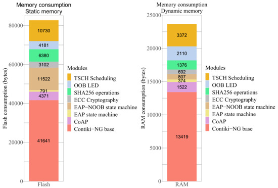 Memory consumption in Contiki. (Left) Static memory: Flash; (Right) Dynamic memory: RAM.