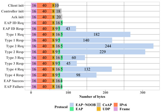 The messages that are necessary for bootstrapping a device with EAP-NOOB range from 74 to 329 bytes in size, which is arguably a significant amount of data, as can be seen in Figure 8. However, any protocol that provides strong security properties, such as perfect forward secrecy and cryptographic agility, without assuming any pre-configured credentials must at least exchange fresh public keys, nonces, and lists of supported cryptographic algorithms. Therefore, the sizes of the EAP-NOOB messages are justifiably large. Moreover, since the bootstrapping step is performed only once during the initial device setup, consuming additional resources for strong security is reasonable. Nevertheless, the overhead of EAP-NOOB could be further reduced by minor tweaks, such as using the more light-weight Concise Binary Object Representation (CBOR) [64] for messages instead of the JavaScript Object Notation (JSON) currently described in the specification. Finally, it is worth noting that the overhead of EAP itself is rather small, only 4–5 bytes per packet. Given this low overhead and the benefits of EAP discussed in this paper thus far, it becomes evident that using the EAP framework for device bootstrapping is a reasonable choice.