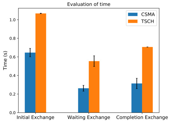 Time for each phase with Carrier Sense Multiple Access (CSMA) and Time Slotted Channel Hopping (TSCH).