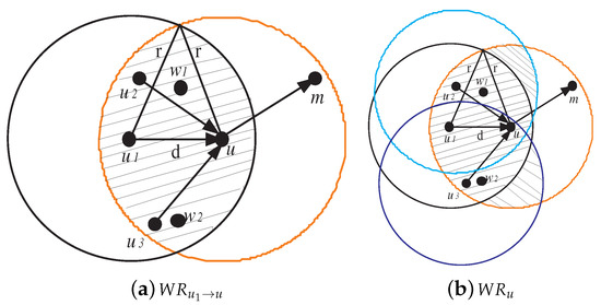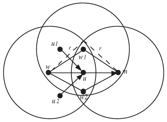 where r denotes the node transmission radius, and denotes the euclidean distance between two points and . Figure 3a shows the witness region for as shaded region. The total witness region for node u, which is shown in Figure 3b, is defined by .